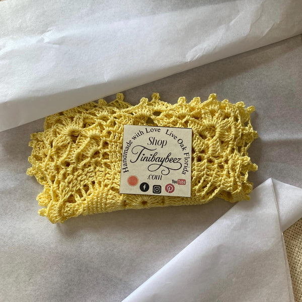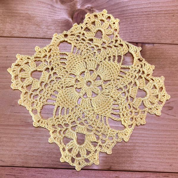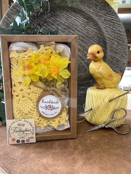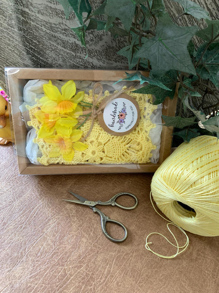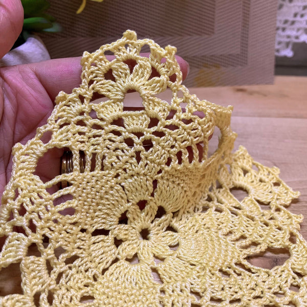 This pale yellow crochet doily gift set is made from a vintage pattern and carefully crocheted by hand, one stitch at a time. I love this soft yellow for spring — it has such a warm, sunny feel and pairs beautifully with flowers or small decorative pieces.