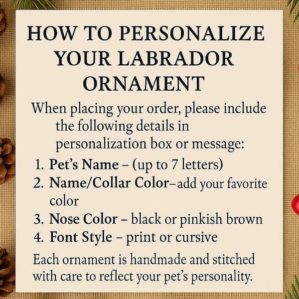 They are entirely stitched by hand are personalized with the embroidered name of your favorite lab (7 letters max). The collar is hand crocheted and available in various colors. Please message me your favorite color and let me know what color thread you would like for the name and what style of lettering (Print or cursive).