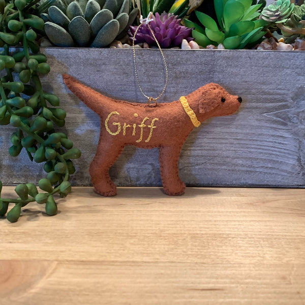 These adorable small felt Labrador Retriever Ornaments are the perfect gift for lab lovers. They are personalized with the hand embroidered name of your favorite lab (7 letters max) and they are entirely stitched by hand. The collar is hand crocheted in various colors. Please message me your favorite color and please let me know what color thread you would like for the name. Also what type of lettering (Print or cursive). They look great displayed on a peg shelf, kitchen cabinet knob or use them as a Christmas ornament. Every stitch is sewn with love and many hours of work went into these little keepsake ornaments. All of my embroidered ornaments are of a delicate nature and they are meant to be displayed only. They will not withstand the wear and tear of repeated handling like a toy. They are not suitable as a toy for small children. Please contact me if you should have any questions about this felt ornament. Please add me to your favorites so you will be notified of any new additions you might be interested in. Thank you for visiting my shop and I hope you enjoyed looking at my work. Tina :-)