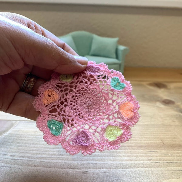 Measuring approximately 2 7/8 inches across, it makes the perfect table covering for a dollhouse table or a charming accent piece for miniature displays. Each colorful heart motif adds to its unique, heirloom-quality look.