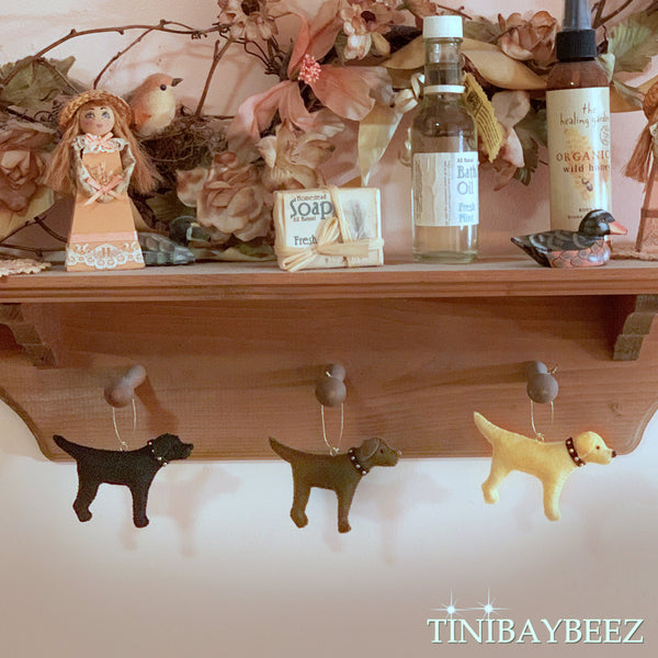 These adorable small Labrador Ornaments are the perfect gift for lab lovers. They are entirely stitched by hand and have a black and gold collar. They look great displayed on a peg shelf, kitchen cabinet knob or use them as a Christmas ornament.